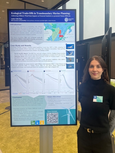 Om dat beter beleid mogelijk te maken, analyseerde de student Governance of Sustainability hoe ecologische risico’s, grensoverschrijdende regelgeving en bestuurlijke processen elkaar beïnvloeden. Ze deed dat in het Natura 2000-gebied de Bruine Bank, een ecologisch waardevol gebied tussen Nederland en het Verenigd Koninkrijk. Haar combinatie van populatiemodellen voor zeevogels, documentanalyse, expertinterviews en observaties leverde een uniek en integraal beeld op.