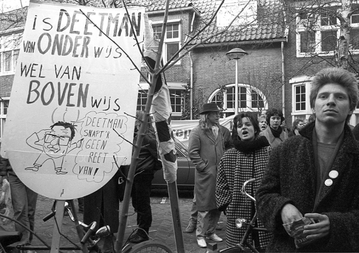 Druk overleg in het Zweetkamertje. In 1969 was Rohde niet bij de bezetting van het Academiegebouw maar in 1985 wel. Foto: Fred Rohde -