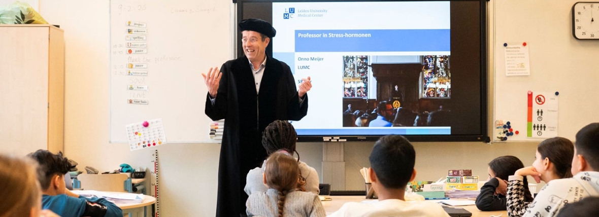Er klinkt opgewonden geroezemoes als Onno Meijer in zijn lange zwarte toga klas 7B inloopt. ‘Hallo allemaal!’, begroet hij de klas. ‘Ik ben een professor. Wat leuk om hier te zijn. Misschien wil je er zelf wel een worden?!’ De kinderen van de openbare basisschool Anne Frank in de Haagse wijk Escamp hebben al een paar voorbereidende lessen gehad van hun eigen juf. Ze weten dat Meijer een professor is ‘in stresshormonen’ en vuren de ene na de andere vraag op hem af. Waarom heeft u voor dit vak gekozen? Hoe komt stress in je lichaam? Heeft u gezweet in het Zweetkamertje en wat is uw lievelingskleur?