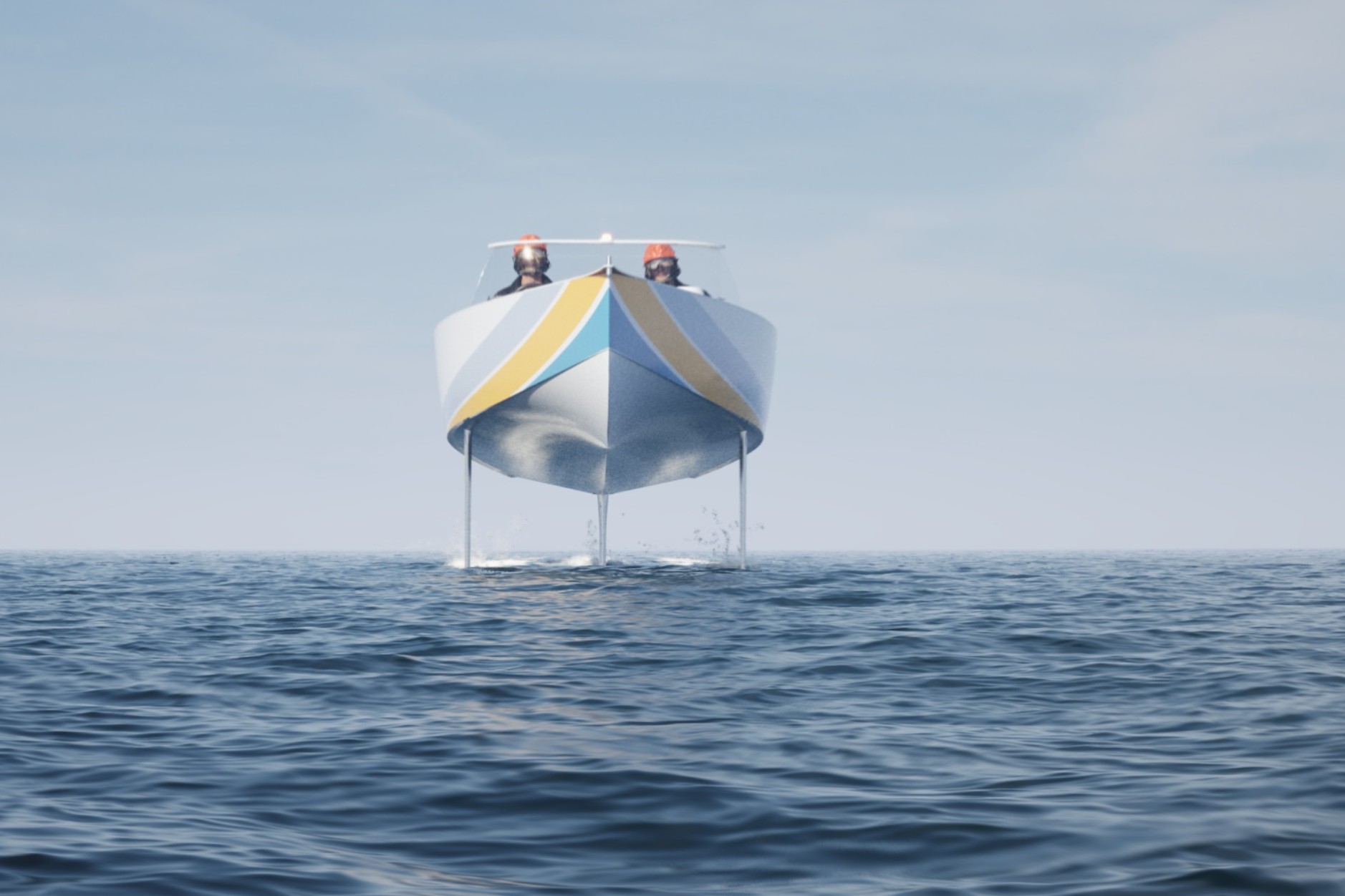 De draagvleugelboot van het team van de TU Delft in 2025. -