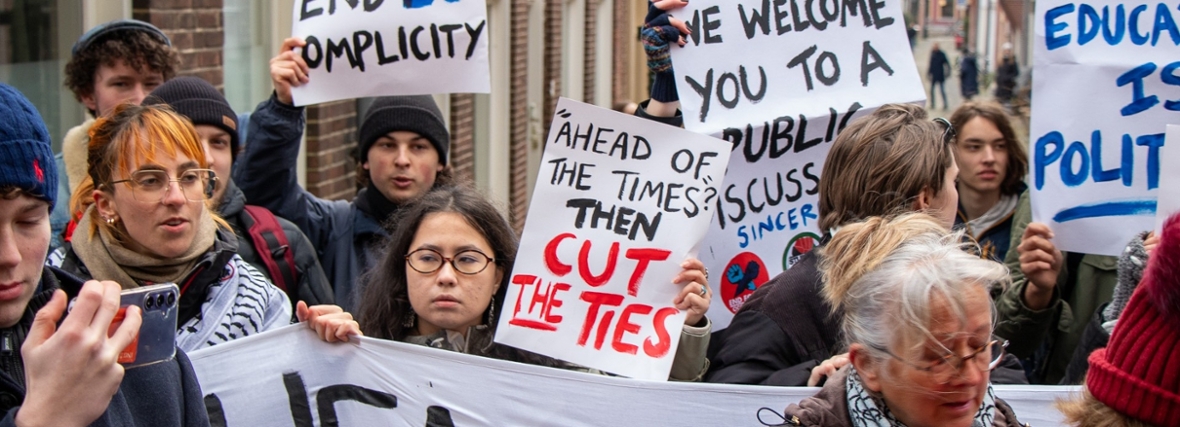 Felle demonstraties en zelfs bezettingen van universiteitsgebouwen: de laatste jaren liepen de gemoederen binnen de universiteit geregeld hoog op. Bijvoorbeeld als het gaat om de samenwerking met Israëlische universiteiten, de fossiele industrie of beveiligingsmaatregelen. Wat is de rol van protest en hoe verhoudt deze zich tot academische vrijheid? Dat vroeg moderator Pieter Slaman aan een bescheiden gezelschap in gebouw Wijnhaven in Den Haag.