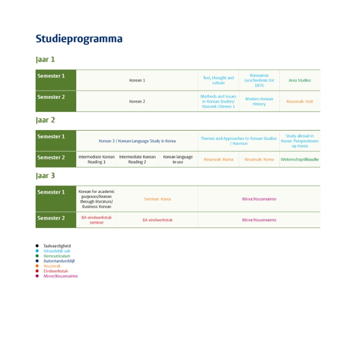 Binnen de opleiding Koreastudies maak je kennis met verschillende vakgebieden. Je verdiept je in taalvaardigheid, letterkunde, geschiedenis, cultuurkunde of sociale wetenschappen.