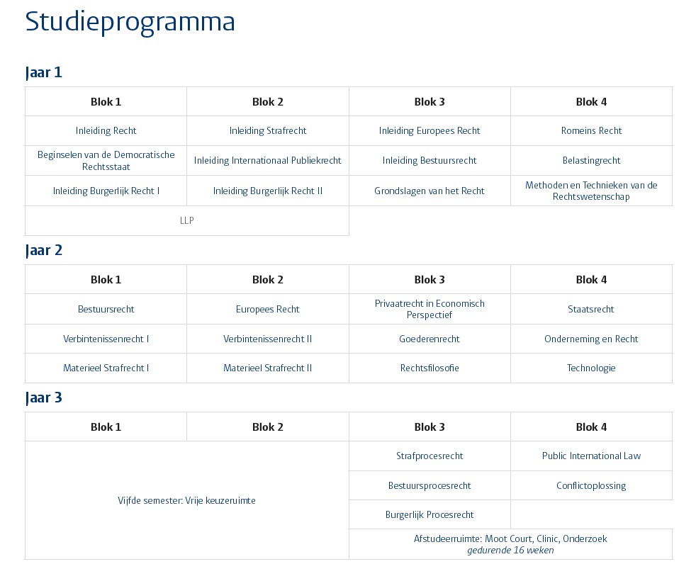 De bacheloropleiding duurt in totaal drie jaar. Naast een reguliere onderwijsweek van 12-14 contacturen per week, besteed je ongeveer 28 uur aan zelfstudie. Gemiddeld ben je dus per week 40 uur met je studie bezig. Het eerste jaar, de propedeuse, is een algemeen jaar met inleidende vakken die de volle breedte van de juridische opleiding laten zien. Ook is er aandacht voor fundamentele vragen over recht en rechtvaardigheid. Op deze manier werk je aan je brede juridische basiskennis. In het eerste jaar is er bovendien veel aandacht voor vaardigheden zoals tekstanalyse, taal- en schrijfvaardigheid en de aanpak voor het oplossen van juridische vraagstukken.