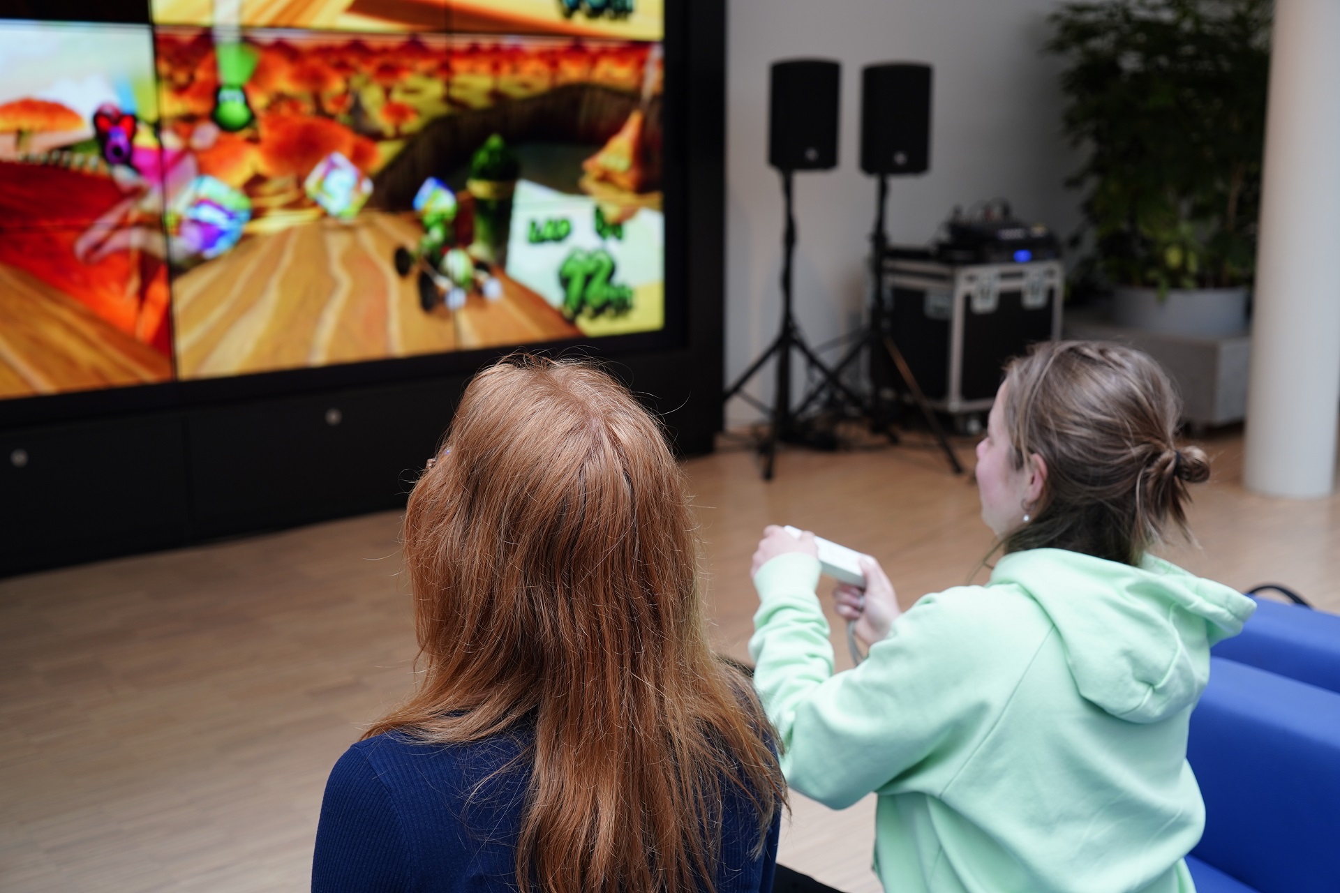 Playing Super Mario Kart on the big screen in the Atrium