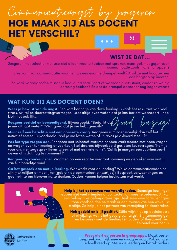 Wist u dat leerlingen met selectief mutisme schrijven, mailen of appen helemaal niet altijd makkelijker vinden dan praten? Soms vragen we te gemakkelijk: “stuur me anders maar even een berichtje” of “schrijf het maar op”. Hoe kunt u als docent het verschil maken voor jongeren die niet durven spreken of mailen?